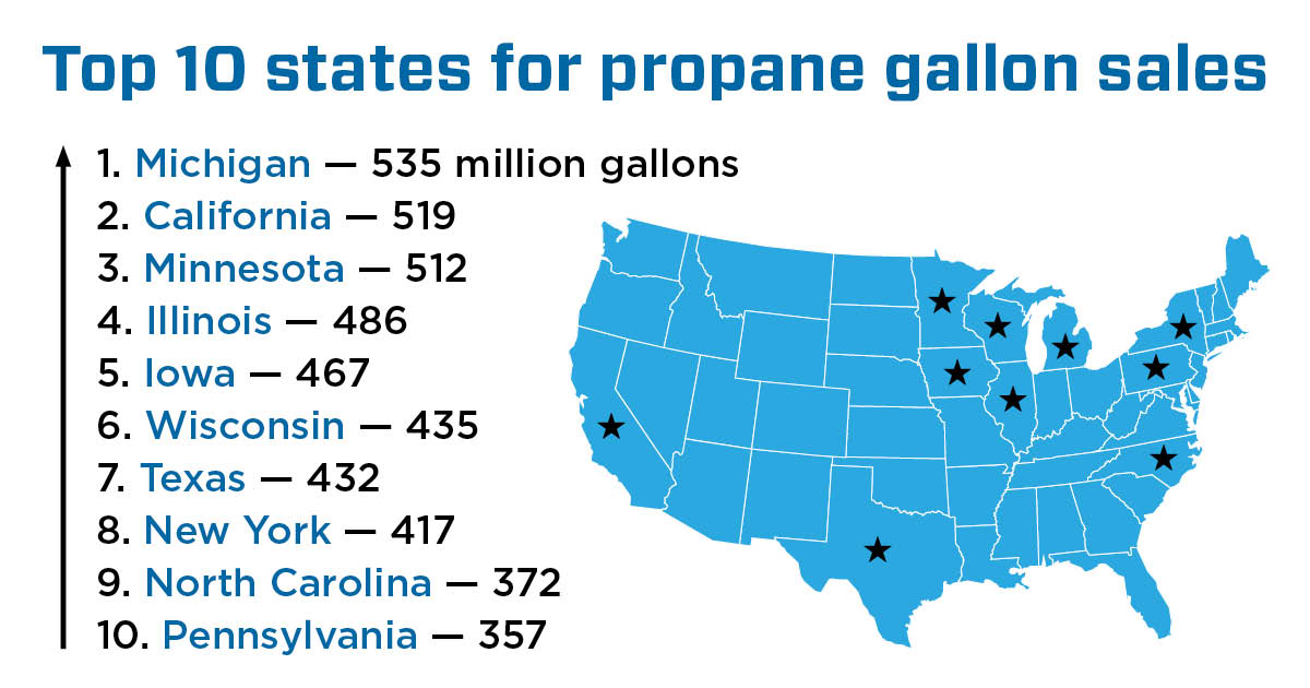 State sales: When comparing states, Michigan ranked first in total gallon sales for the third straight year. Here’s a look at the top 10, which accounted for 48 percent of total U.S. propane sales: