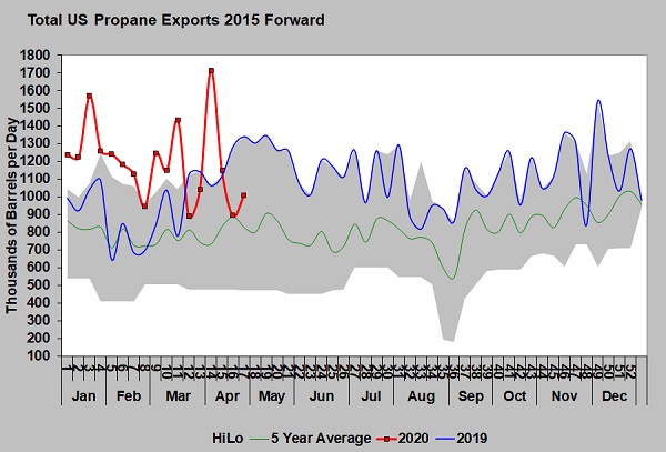 Over the same 17-week period, propane exports have been higher than last year. So far this year, exports have averaged 213,000 bpd more than last year. That is the equivalent of 894 truck or 298 rail car loads.