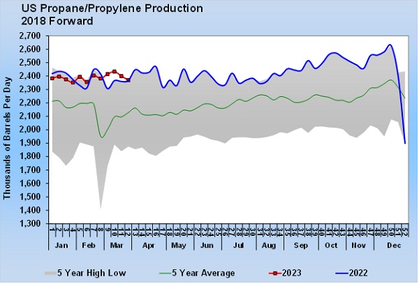 With the growth in crude and natural gas production slowing from last year, so does propane production. So far this year, U.S. propane production is 9,000 barrels per day (bpd) higher than last year. That is a far cry from the 158,000-bpd supply growth seen during the first 12 weeks of last year compared to 2021. Part of the big gain between 2021 and 2022 was that the winter storm in 2021 severely hurt production in February. Still, the leveling out of propane production is obvious.