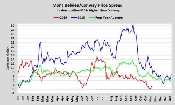 But, with the Mariner East system operational, Conway prices have improved. This year, the spread was 4.5 cents on the same day it reached 30.625 cents last year.