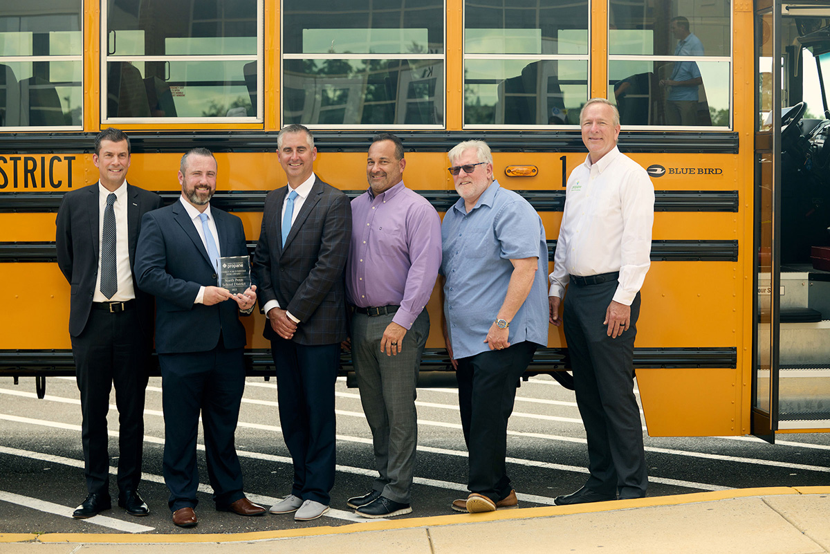 From left, Steve Skrocki, CFO, North Penn School District; Dennis Ryan, coordinator of transportation, North Penn School District; Todd Bauer, superintendent, North Penn School District; Tony Bandiero, executive director, Eastern Pennsylvania Alliance for Clean Transportation; Mason Hemphill, account representative, M.A. Brightbill Body Works; and Steve Whaley, director of autogas business development, Propane Education & Research Council. (Photo: PERC)