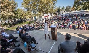 Joy Alafia, president and CEO of the Western Propane Gas Association, addresses students and faculty during the Propane Education & Research Council event at the Sierra Enterprise Elementary School in Sacramento, California. Photo courtesy of PERC.