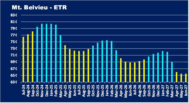 Propane retailers can get price protection out to June 2027 on the futures market. Every day in our reports, we show this curve. Focus on the blue bars, which are the winter months. Note how they are stair-stepping down.