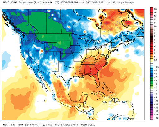 This map shows temperature averages from mid-December to mid-March. March was on pace to finish colder than normal. Image courtesy of WeatherBELL Analytics. Click to enlarge.