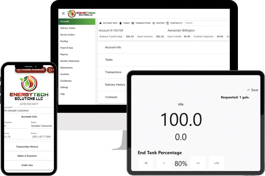 Energy Tech Solutions offers a premier software package for fuel companies. We believe technology should be affordable, so if you’re interested in back-office software that is everything you need at a price that won’t break the bank, then look no further. Our office AR program is sleek, cloud-based, easy to use and works in tandem with a mobile app for use in your delivery and service trucks. Routing has never been so easy. Simply create and optimize routes in the office from open delivery orders on a digital map, and send them to your drivers’ tablets. The mobile app gets you to your destination and immediately relays new invoices to the office upon completion. Contracts, parts/liquid inventory, QuickBooks Online integration, POS, credit card processing, customized reports, email transactions, an online customer portal and more come with our 24/7 customer service. We love customer feedback; if there’s a feature you need, please request it. Customer suggestions are what drive us to continuously create a better product.