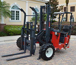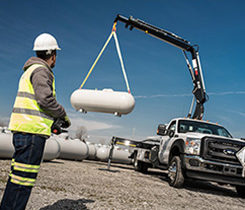 Hiab’s hydraulic-controlled tank clamp attachment for the MOFFETT truck-mounted forklift allows transport of bulk propane tanks up to 1,000 gallons.