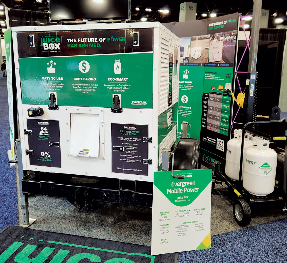 Evergreen Mobile Power says its 25-kW JuiceBox mobile power unit, running on propane or natural gas, offers low maintenance costs, easy and reliable operation, and an environmentally friendly option to meet a variety of power needs. The company says the JuiceBox can be found in applications for the equipment rental industry, autogas, oil fields, auto racing venues, construction, homebuilding, disaster relief and battery energy storage systems, among others. In addition, propane marketers are using the JuiceBox as a source of additional revenue from rental/leasing operations, taking gallons from the diesel generator market that previously had been the standard fueling option, according to the company. In the new generation of power gen, customers are looking for a cleaner alternative to diesel, the company adds.