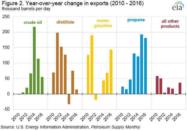 U.S. crude oil and petroleum product exports more than doubled from 2.4 million barrels per day (bpd) in 2010 to 5.2 million bpd in 2016, according to the Energy Information Administration (EIA).