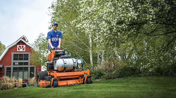 At the same time, since switching to propane, Duschene has seen his maintenance needs decrease. Because there is very little carbon in propane, the mowers don’t experience carbon buildup in the oil, which nearly doubles the lifespan of an oil change, he says. Before the switch, Duschene says he experienced ethanol contamination in his gas-powered trimmers and blowers, which required replacement of their carburetors once a year.